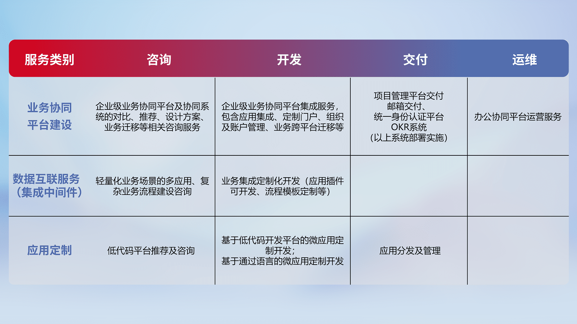 针对钉钉、、、、企微、、、、IDaas等平台级产品提供产品的规划、、、方案、、、交付、、、、定制化开发等服务,,实现如统一协同办公、、、、智能客户服务、、、混合会议管理、、、、智能数据查询、、等业务场景,,,,实现数字化转型。。